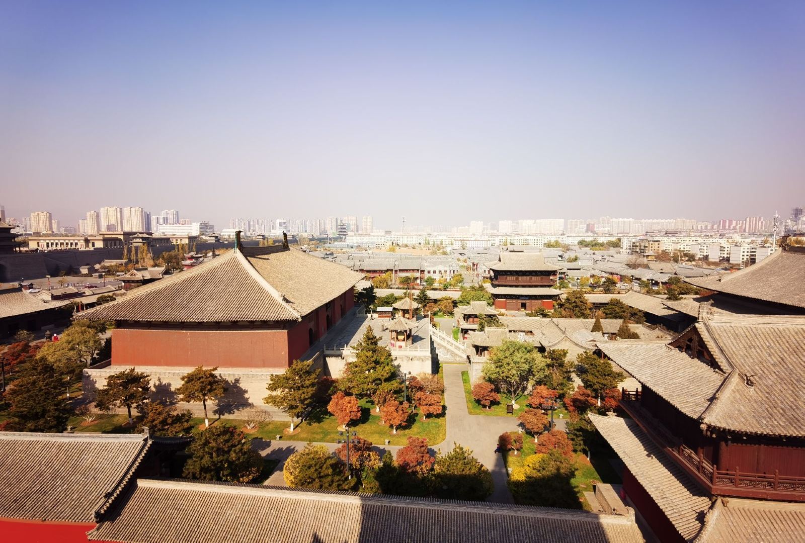 华严寺亦名大华严寺,位于大同城内清远街中段西侧。南北长207.6米,东西宽298米,占地面积61865平方米。依契丹族崇日习俗,寺址坐西朝东,始建于辽,现存最早建筑为薄伽教藏殿,建于辽重熙七年(1038),清宁八年(1062)重建,是年并“奉安诸帝石像、铜像”,兼具皇室宗庙性质。保大二年(1122)寺因兵火受损。大雄宝殿于金天眷三年(1140)重建,元至大年间(1308-1311)补葺,明成化、万历年间(1465-1620)寺院一分为二,上寺居于西北侧,下寺偏东南,自成格局。清代屡有修葺,2008年进行周边环境综合治理及华严寺辽金文化博物馆修建工程,渐成今日规模。上寺以大雄宝殿为主,清代增建山门、享殿、观音阁、地藏阁,布局严谨。上寺前隅原有辽建海会殿一座,毁于20世纪50年代,台基尚存。下寺中轴线建有山门、薄伽教藏殿,两厢明清建配殿、厢房。薄伽教藏殿内现存辽代壁藏楼阁、彩塑、琉璃以及经幢、碑刻和明清时期木雕、彩塑、壁画等,荟萃了历代佛教文物精华。寺内现存薄伽教藏殿和大雄宝殿为辽金建筑,其余均为明清时期建筑。1961年3月4日公布为全国重点文物保护单位。