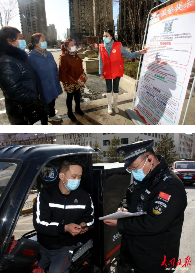 此外,平城区各街道社区依托小区党支部、物业公司、志愿者等力量,常态化开展黄码红码人员的排查,做到不漏一户、不少一人。同时,街道及社区持续做好“线上+线下”科学防疫宣传,通过小视频、微信群、流动“小喇叭”、户外宣传栏等方式,及时科普防疫、疫苗接种等知识,引导辖区居民正确应对疫情,做到科学防疫,理性应对。
