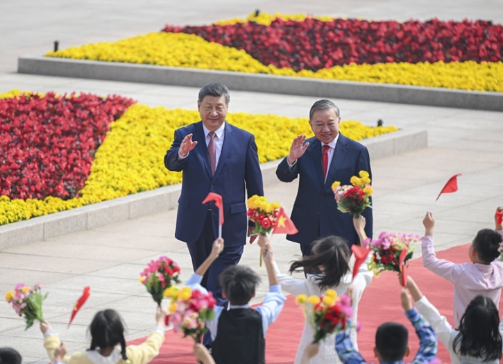 4月15日上午,中共中央总书记、国家主席习近平在北京人民大会堂同来华进行国事访问的越共中央总书记、国家主席苏林举行会谈。这是会谈前,习近平在人民大会堂东门外广场为苏林举行欢迎仪式。新华社记者 李响 摄
