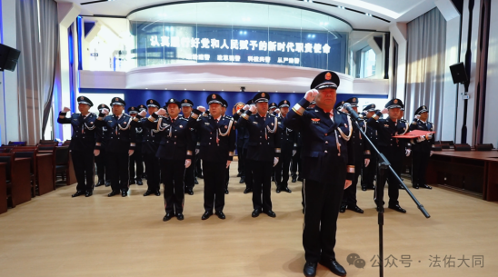 揭牌仪式后,各所、队室负责人在北二楼会议室整齐列队,面向鲜艳的中国人民警察警旗庄严宣誓。市公安局副局长、平城区副区长、分局党委书记、局长姜宝举在宣誓仪式上致辞,向全体民辅警致以节日问候,勉励大家以公安工作现代化建设为契机,持续筑牢安全防线、增进民生福祉。