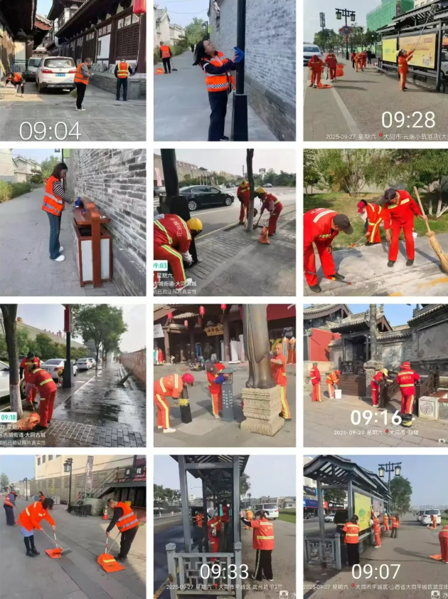 为迎接国庆、中秋双节到来,给市民与游客营造洁净雅致的游览环境,平城区环境卫生服务中心启动节前环境卫生集中提升行动,以“清、洗、冲、擦、扫”一体化作业模式,为千年古城“净面梳妆”。