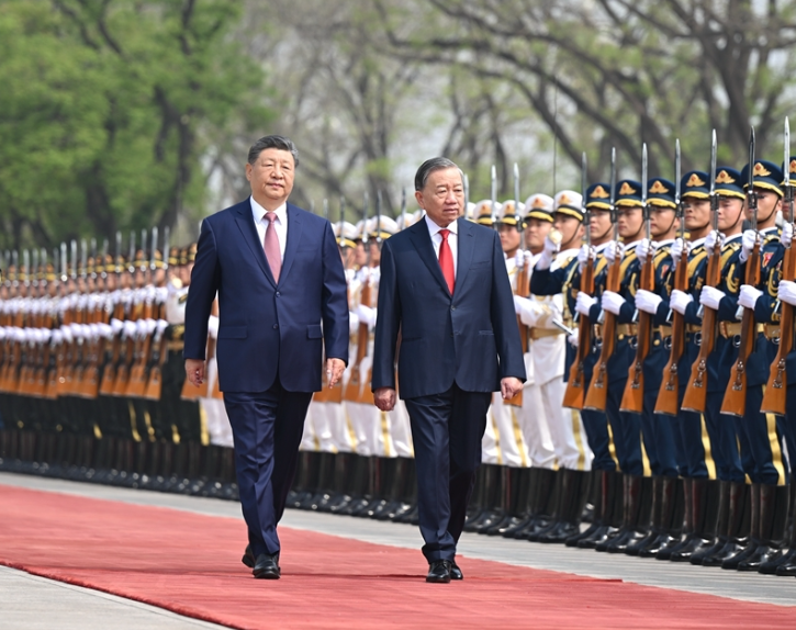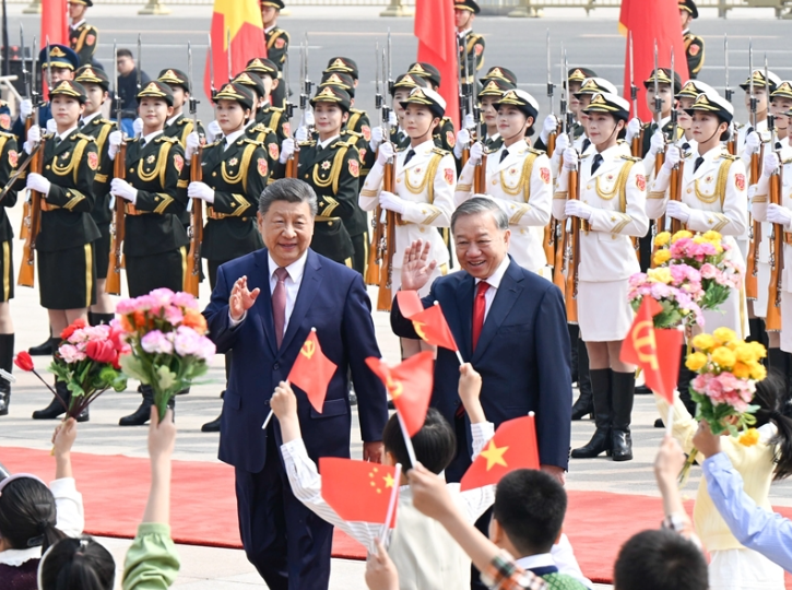 4月15日上午,中共中央总书记、国家主席习近平在北京人民大会堂同来华进行国事访问的越共中央总书记、国家主席苏林举行会谈。这是会谈前,习近平在人民大会堂东门外广场为苏林举行欢迎仪式。新华社记者 李响 摄
