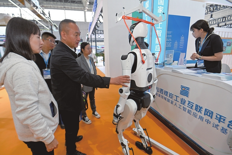 晋云科技展位,观众正在了解智能机器人。该机器人已应用于矿下主煤流皮带运输系统异物捡取及智能巡检等工作。申晋光摄