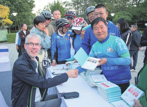 “绿色并州、低碳同行—绿色出行交流活动暨《骑行漫记》作者见面会”上,英国漫画家戴夫·沃克为读者签名留念。 山西经济日报记者 张剑雯 摄
